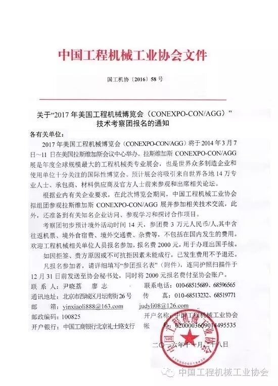 根據(jù)業(yè)內(nèi)有關(guān)企業(yè)要求,在此次博覽會(huì)期間,中國工程機(jī)械工業(yè)協(xié)會(huì)擬組團(tuán)參觀拉斯維加斯CONEXPO-CON/AGG展并參加相關(guān)技術(shù)交流,此外,還準(zhǔn)備到有關(guān)知名企業(yè)訪問、參觀學(xué)習(xí)和探討合作項(xiàng)目。