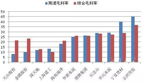圖2:各企業(yè)2016年商混業(yè)務毛利率與公司整體毛利率水平比較(%)