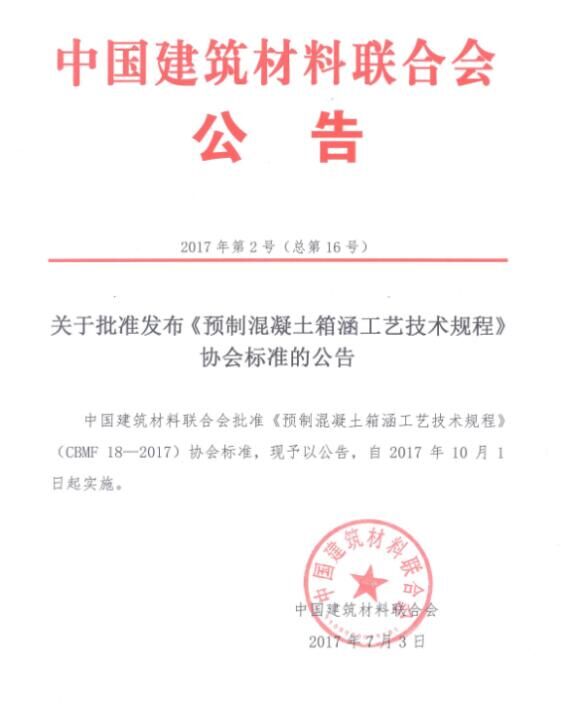 摘要:2017年7月,由中國混凝土與水泥制品協(xié)會(以下簡稱協(xié)會)組織制定的《預制混凝土箱涵工藝技術(shù)規(guī)程》和《混凝土用氧化鎂膨脹劑》兩項協(xié)會標準,通過審定并發(fā)布批準公告,標準號分別為CBMF 18-2017和CBMF 19-2017,將同時于2017年10月1日起實施。
