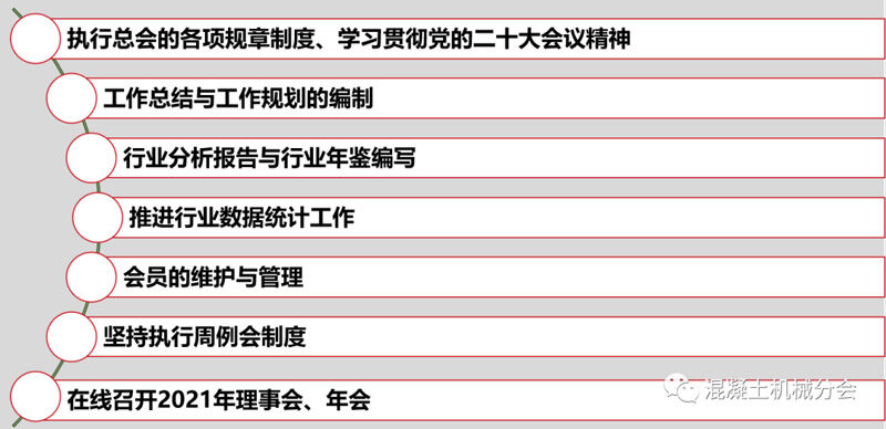 協(xié)會(huì)篇主要內(nèi)容包括:規(guī)劃混凝土機(jī)械行業(yè)發(fā)展戰(zhàn)略與發(fā)展目標(biāo)。不斷加強(qiáng)團(tuán)隊(duì)建設(shè)與組織建設(shè)、服務(wù)會(huì)員企業(yè)、引導(dǎo)行業(yè)解決卡脖子問題、維護(hù)行業(yè)發(fā)展秩序、打造行業(yè)上下游全產(chǎn)業(yè)鏈緊密聯(lián)動(dòng)的行業(yè)協(xié)會(huì),加速推進(jìn)國產(chǎn)化進(jìn)程,推動(dòng)行業(yè)高標(biāo)準(zhǔn)、高質(zhì)量發(fā)展。