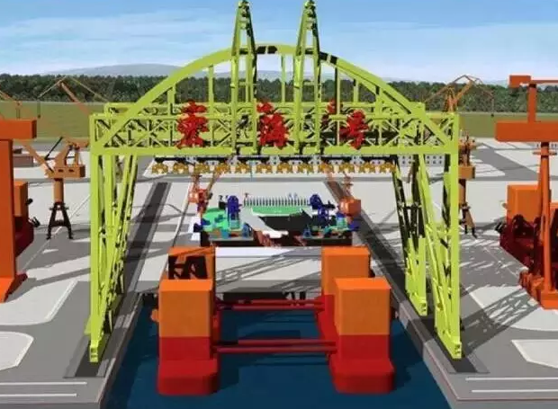 “宏?!碧?hào)22000噸起重機(jī),主要用于海上石油鉆井平臺(tái)整體的從陸地運(yùn)到海上,將以往“化整為零”的建造方式變?yōu)椤罢嬲 ?。借?2000噸起重能力的“大家伙”,把拼裝好的海洋油氣鉆井平臺(tái)從陸地上的專(zhuān)用拼裝胎位上提起來(lái),直接放到海上去。設(shè)備總體高度150米,提升高度最高為65米,相當(dāng)于把重量為500節(jié)高鐵車(chē)廂或20層樓高的超重、超大型物件提升起來(lái)并行走。主體采用桁架式結(jié)構(gòu)、拱形外觀、多吊點(diǎn)雙吊梁承載,跨度124.3米,宏海號(hào)總重14800噸,相當(dāng)于兩個(gè)埃菲爾鐵塔的重量?!伴_(kāi)下門(mén),快遞到了啊,你的鉆井平臺(tái)~”