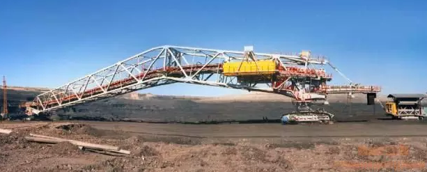 排土能力達(dá)到34000噸/小時(shí),臂長(zhǎng)超過(guò)120米。皮帶排土機(jī)為移動(dòng)式連續(xù)工作的排料設(shè)備,它們將來(lái)自可移動(dòng)梯段皮帶運(yùn)輸機(jī)的物料排卸在料堆上,借助皮帶轉(zhuǎn)載車(chē)和皮帶滑行轉(zhuǎn)載車(chē)將物料輸送到排土機(jī)。排土機(jī)有能力堆高低地、作為行駛路面的平盤(pán),以便隨后用做新采區(qū)的卸料、堆高。除此之外,還可以使用一部皮帶排土機(jī)為可移動(dòng)梯段皮帶運(yùn)輸機(jī)堆起一個(gè)高平面。說(shuō)白了,它就是一個(gè)堆土的設(shè)備嘍~