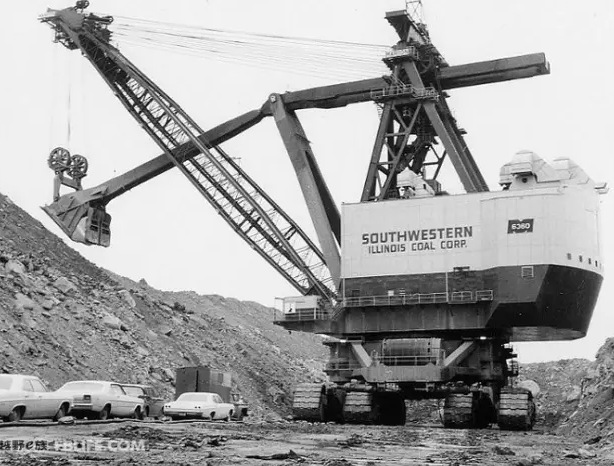 這個(gè)電鏟1965年問(wèn)世,組裝它花了約兩年時(shí)間,最終的建造費(fèi)用在當(dāng)時(shí)超過(guò)1500萬(wàn)美元,在美國(guó)Southwestern Illinois的“Captain”露天煤礦使用,其高度相當(dāng)于21層樓,使用7000V的高壓電,行走裝置為8條履帶,斗臂長(zhǎng)度為41米,最大挖掘高度67.2 m,是迄今全球最大的電鏟,因火災(zāi)毀損于1992年爆破拆解,一生的挖掘量達(dá)到6億2千萬(wàn)方。沒(méi)有見(jiàn)證這一奇跡真是遺憾吶~