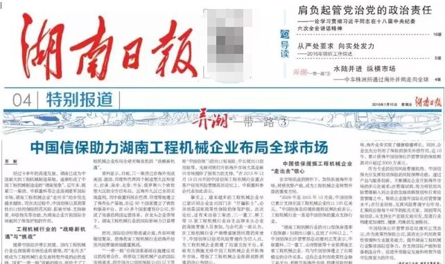 近日,《湖南日報》專版刊登了宣傳報道《中國信保助力湖南工程機械企業(yè)布局全球市場》。報道肯定了中國信保在履行政策性職能方面取得的成效,并介紹了中國信保長沙營管部在支持湖南省工程機械行業(yè)企業(yè)更好地“走出去”所采取的措施。報道詳情如下: