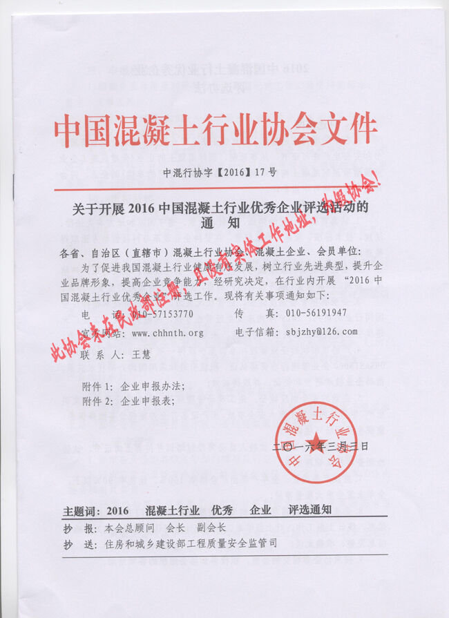 近日,有多家省市協(xié)會(huì)和有關(guān)生產(chǎn)企業(yè)向分會(huì)秘書處反映收到“中國混凝土行業(yè)協(xié)會(huì)”2016(16、17、18、19、20)文件開展所謂的“中國混凝土行業(yè)評選活動(dòng)”的通知。
