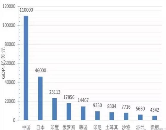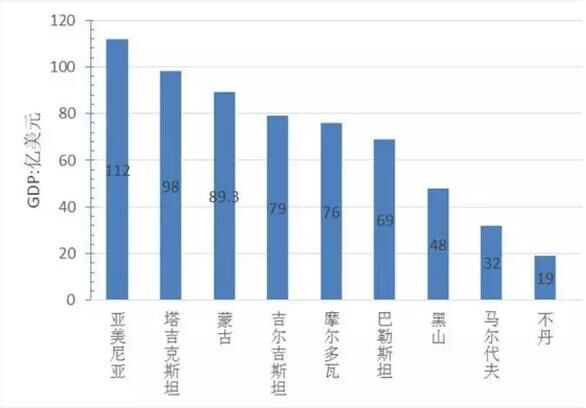 從經(jīng)濟(jì)總量看,GDP超過1萬億美元的國家5個(gè),分別為中國、日本、印度、俄羅斯、韓國,其中中國經(jīng)濟(jì)總量為11萬億美元、位居第一、為最小國家不丹的5800倍,約占“一帶一路”地區(qū)經(jīng)濟(jì)總量的40%;GDP在5000億到1萬美元的國家4個(gè),分別是印尼、土耳其、沙特、波蘭;GDP在1000億到5000億美元的國家19個(gè),GDP在100億到1000億美元的國家30個(gè);低于100億元美元的國家8個(gè),分別為塔吉克斯坦、蒙古、吉爾吉斯坦、摩爾多瓦、巴勒斯坦、黑山、馬爾代夫、不丹,其中經(jīng)濟(jì)規(guī)模最小為不丹、GDP為19億美元。