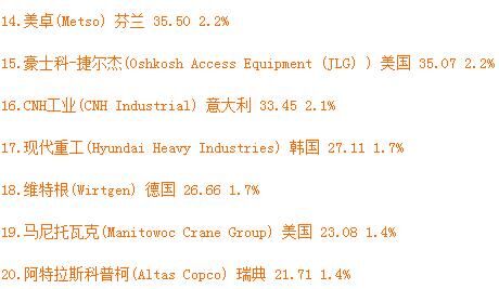 從表單中不難看出,卡特彼勒、小松的世界排名相對穩(wěn)定,仍然位居第一、第二名。其中卡特彼勒占總市場收入的18.1%。較之2015年,特雷克斯上升兩個名次,位居第三位。特雷克斯取代日立排名第三,日立建機排名第四,利勃海爾位列第五,沃爾沃排名第六。除此之外,斗山和杰西博分別上升兩個名次,擠進(jìn)前十名。