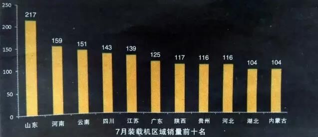 今年前7月,除2月份出口量不足800臺(tái),其它月份出口數(shù)量基本均在1000~1300臺(tái)的區(qū)間內(nèi)上下波動(dòng),相對(duì)比較平穩(wěn)。分區(qū)域來(lái)看,山東省繼續(xù)保持領(lǐng)先,7月份銷(xiāo)量達(dá)到217臺(tái),其余省份銷(xiāo)量均未達(dá)到200臺(tái),天津、上海、青海、海南、西藏等仍是銷(xiāo)量最少的省、市、自治區(qū)。
