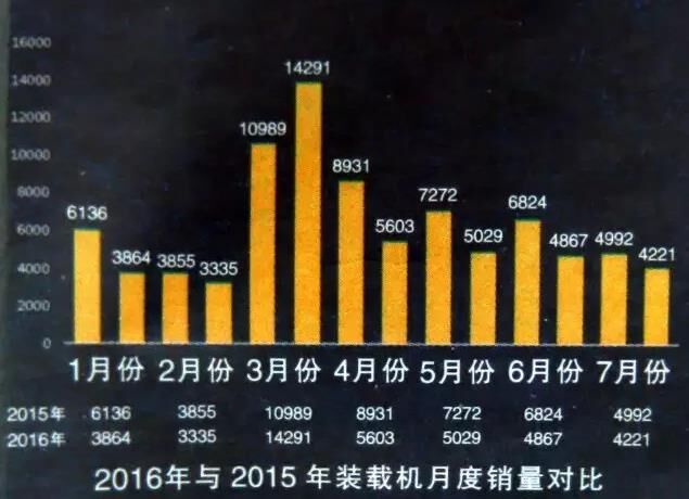 據(jù)公布的數(shù)據(jù),7月份全國(guó)26家主要裝載機(jī)生產(chǎn)企業(yè)共銷(xiāo)售各類(lèi)裝載機(jī)4221臺(tái),同比2015年7月份的4992臺(tái),下降15.44%;環(huán)比6月份的4867臺(tái),下降13.27%。其中3噸及以上裝載機(jī)銷(xiāo)量為3796臺(tái),3噸以下小型裝載機(jī)銷(xiāo)量為425臺(tái)。從細(xì)分類(lèi)型來(lái)看,3噸及5噸裝載機(jī)為主力銷(xiāo)售機(jī)型,合計(jì)銷(xiāo)量占比達(dá)到80%。綜合來(lái)看前7月銷(xiāo)量,除3月份曇花一現(xiàn)般同比大幅增長(zhǎng)30.05%外,其余月份裝載機(jī)銷(xiāo)量均在下滑。但一個(gè)積極的現(xiàn)象是,4月份以來(lái)裝載機(jī)雖持續(xù)下滑,但降幅一直在收窄,自4月份的37.26%收窄到7月份的15.44%。