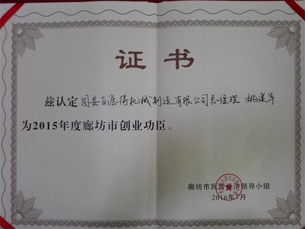 近日,固安百濾得機械制造有限公司總經(jīng)理姚建軍榮獲廊坊市創(chuàng)業(yè)功臣獎,獎金十萬元整,也正是如此,更加說明市場對百濾得的認可,百濾得對市場的優(yōu)質服務。