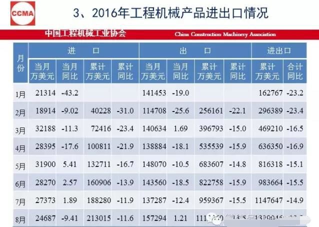 今年9月份挖掘機同比銷量增加71.4%,1到9月增長26.3%。出口還是在高位,但是還有13%左右的降幅。在裝備制造業(yè)里,尤其是機械行業(yè)里,我們還是比較好的,進口的數是越來越少。