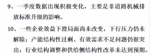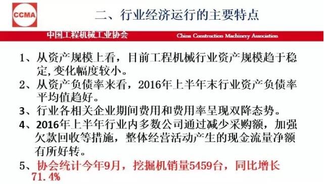 我個人總結,今年的運行情況有這樣十個方面。第一,從整個全行業(yè)各企業(yè)的資產規(guī)模上看,目前趨于穩(wěn)定,變化幅度很小,不像前兩年振動那么大。第二,從資產負債率來說,現在負債率是在60%左右,全國的工業(yè)企業(yè)是56%。所以,這個行業(yè)的資產負債率目前看也是很好的。這個需要引起大家的關注和分析,我們也希望后幾個月情況可以穩(wěn)定向好。還有自主品牌市場占有率,在國內市場還是保持高位,從全行業(yè)來看在90%以上。那么,產業(yè)的集中度又進一步地增強了,但有一些企業(yè)挺無助的,出局了,進口額下降。今年按照環(huán)保部5號令,全行業(yè)工程機械產品實現了新的標準升級。整個產品進行了更新換代,這個非常難能可貴。最后是產能結構性過剩,有效需求不足問題仍然突出,行業(yè)結構調整還有供給側結構改革遠遠沒有達到預期。即便是按照現在的挖掘機銷量5500多臺,就算是6000臺,產能又有多少?一旦市場回暖,一些企業(yè)家還是會頭腦一熱,這樣大一個產能釋放出來的產量是什么局面?我們必須保持一個清醒的頭腦。
