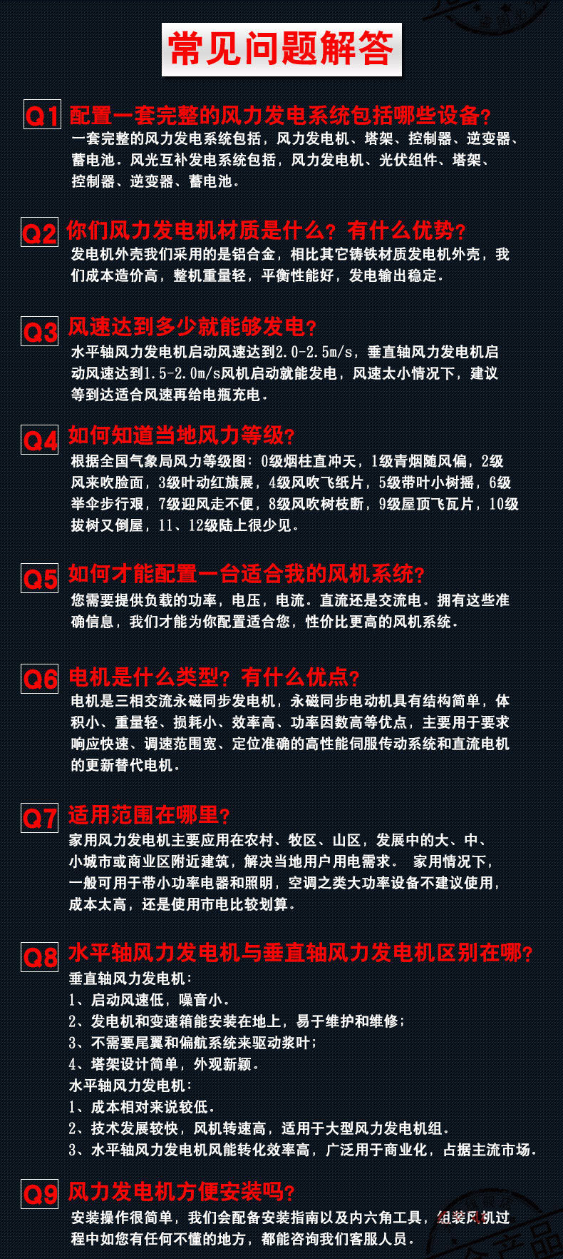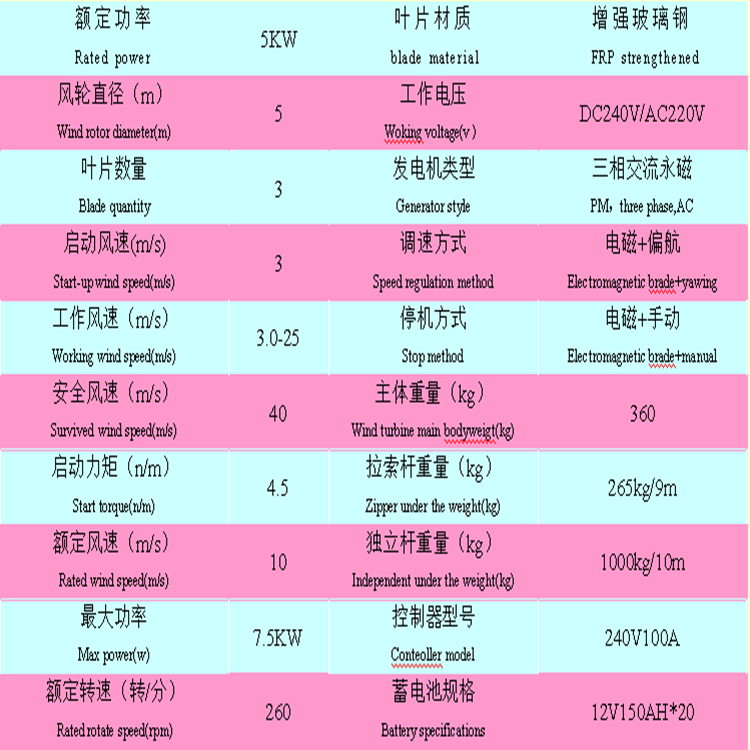 注意:以上寶貝報價為風(fēng)力發(fā)電機主體的價格(含:5KW發(fā)電機、回轉(zhuǎn)體、尾舵、風(fēng)輪、風(fēng)葉等組件),如需逆變器、蓄電池、控制器、太陽能板或塔架,請咨詢客服。