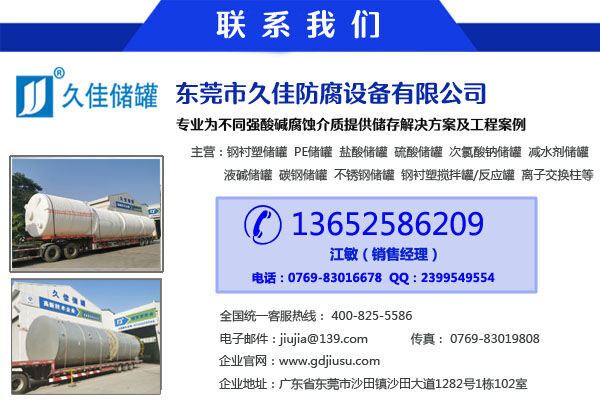 東莞市久佳防腐設(shè)備主營產(chǎn)品有鋼襯塑儲罐、全塑儲罐、碳鋼儲罐、離子交換柱、攪拌罐等防腐設(shè)備,主要有鋼襯塑和全塑兩大系列,分臥式和立式,品種齊全,可滿足客戶的需求,廣泛應(yīng)用于化工、環(huán)保、電力、釀造、儲存、運輸?shù)刃袠I(yè)。